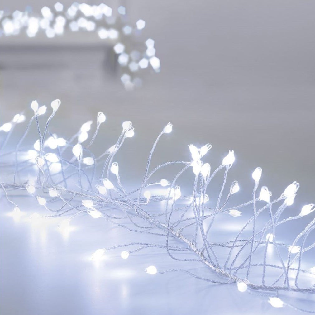 1.8 metres of lit length - 288 white LED Ultrabright light garland with silver wire.