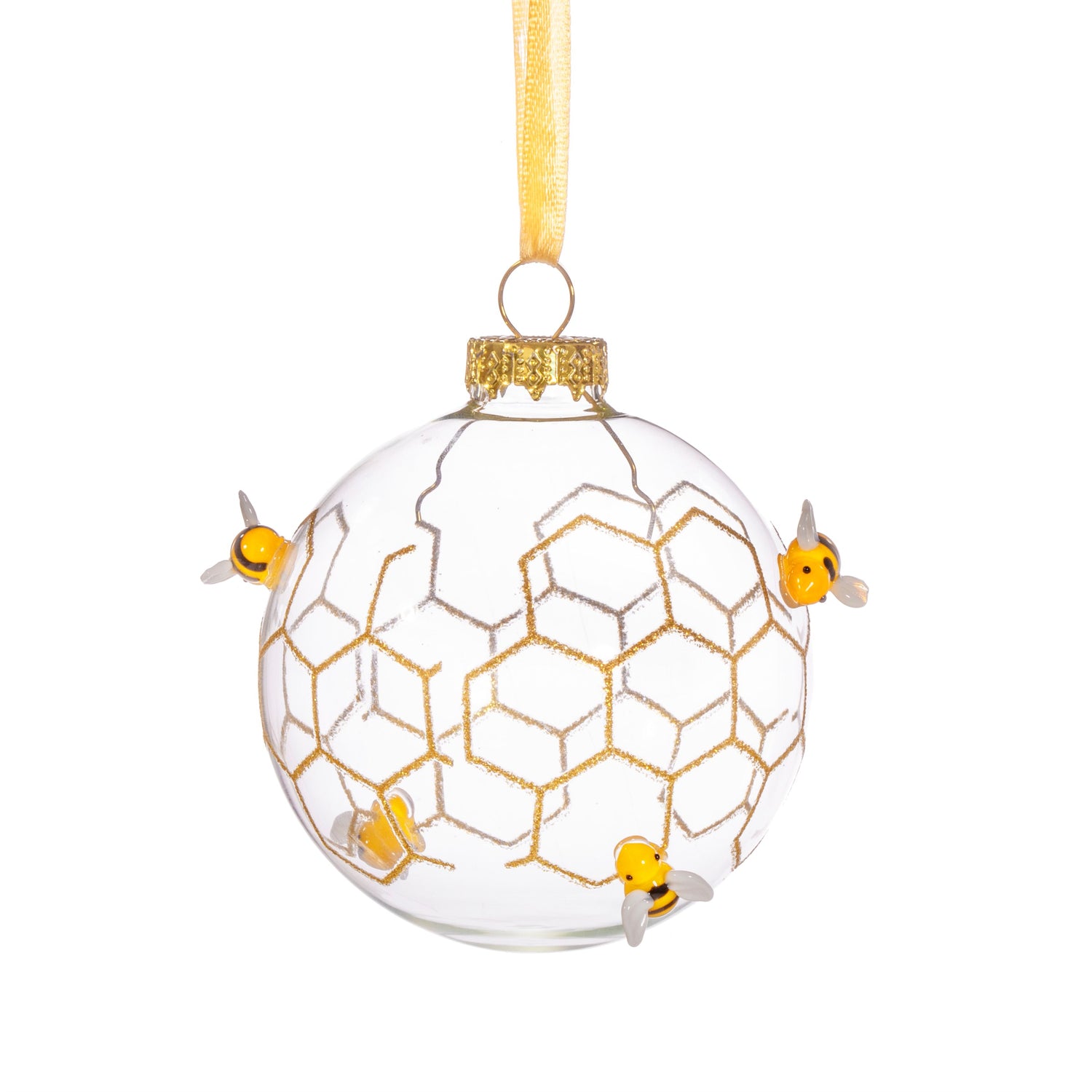 Clear glass hanging Christmas bauble with golden honeycomb design and 3D bees. The baubles are made from glass and have golden ribbon to hang from your tree or around your home.