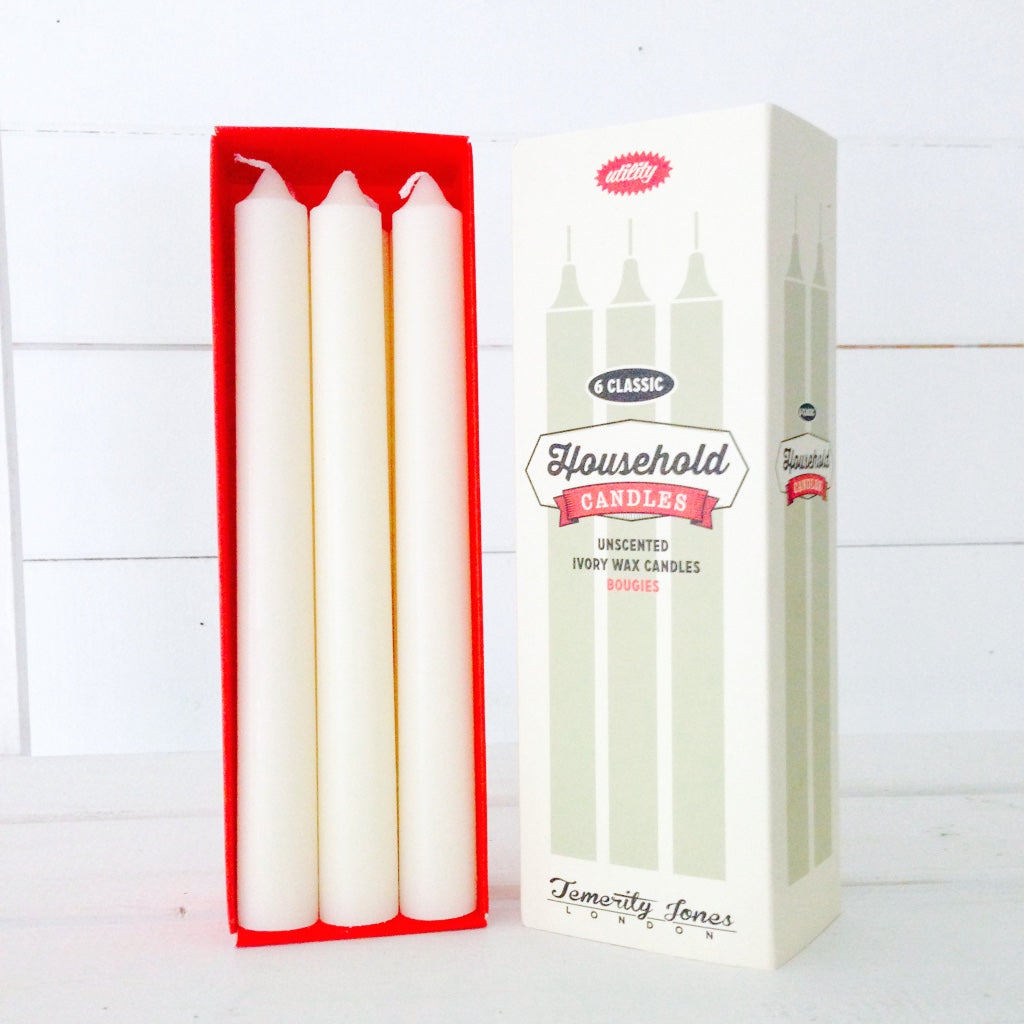 A handy pack of 6 white candles, use them at the dinner table, candles sticks in windows or mantle pieces, or our favourite way it to use them with a natural holly wreath, on the table to create a traditional advent wreath. This candle is not scented.
