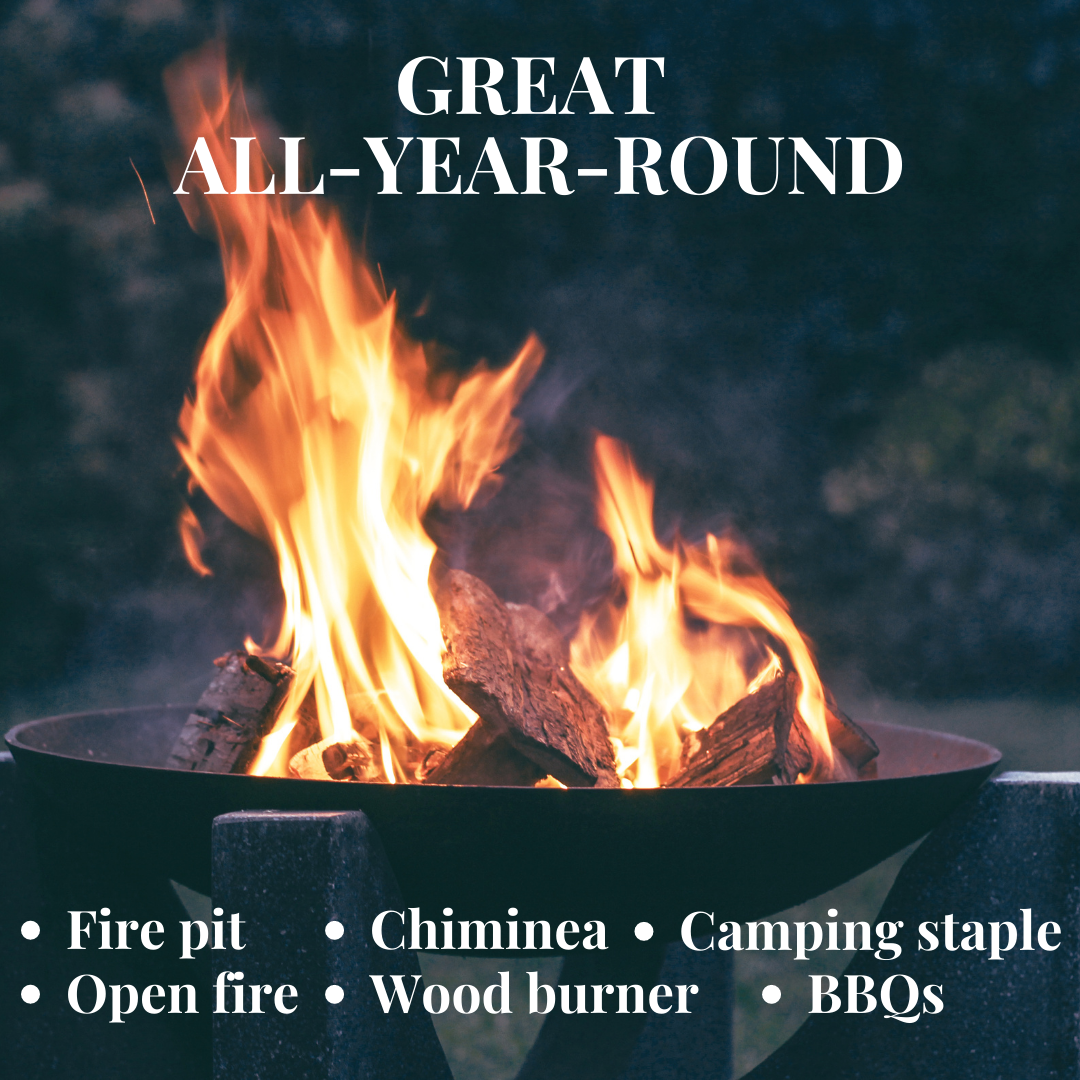 - Great all year round for home fires + fire pits + chimineas + BBQs + wood burners + stone pizza ovens + campfires
