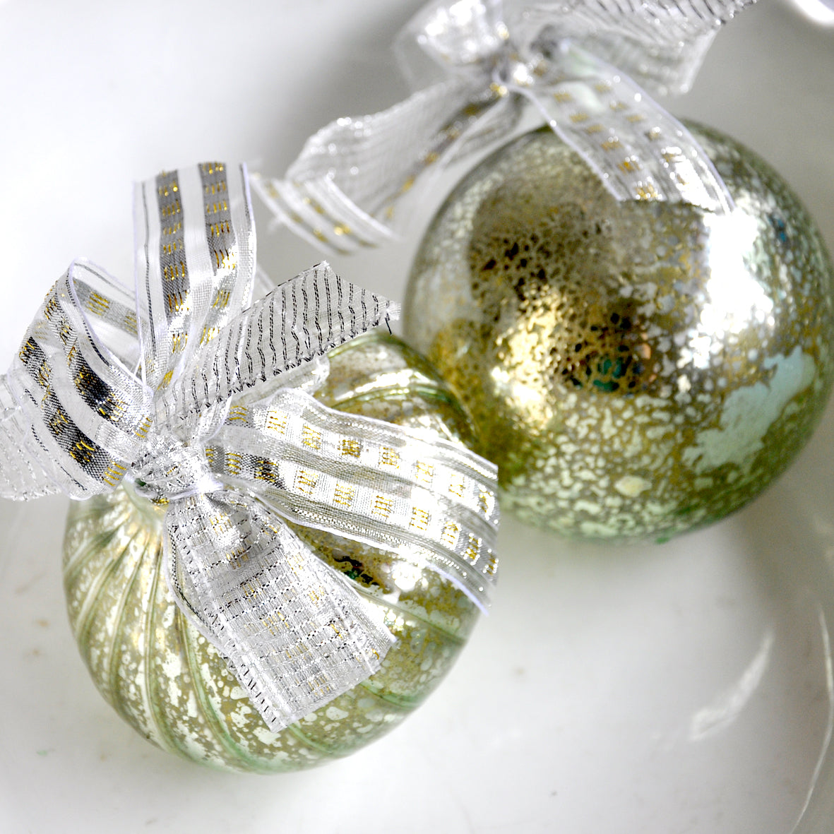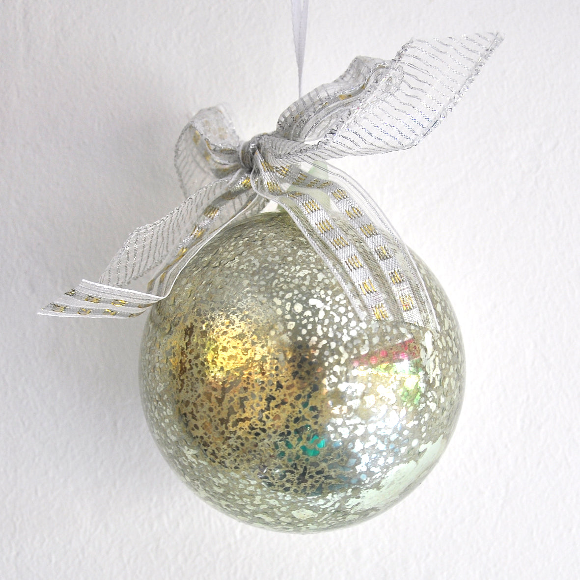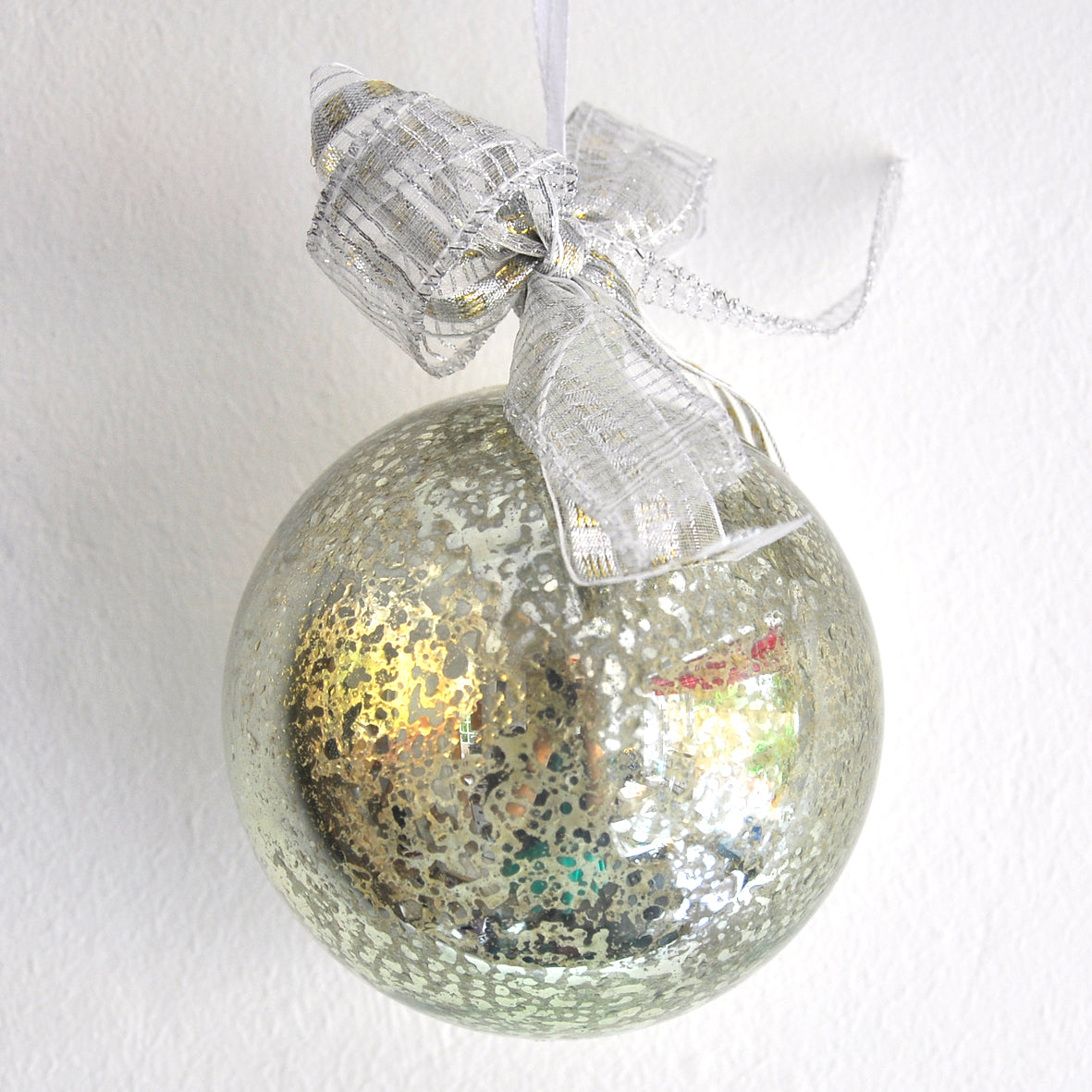 Antique pastel green glass handing Christmas tree decoration. This round shaped decoration comes with a double silver bow and thread loop for hanging on the tree or around the home.