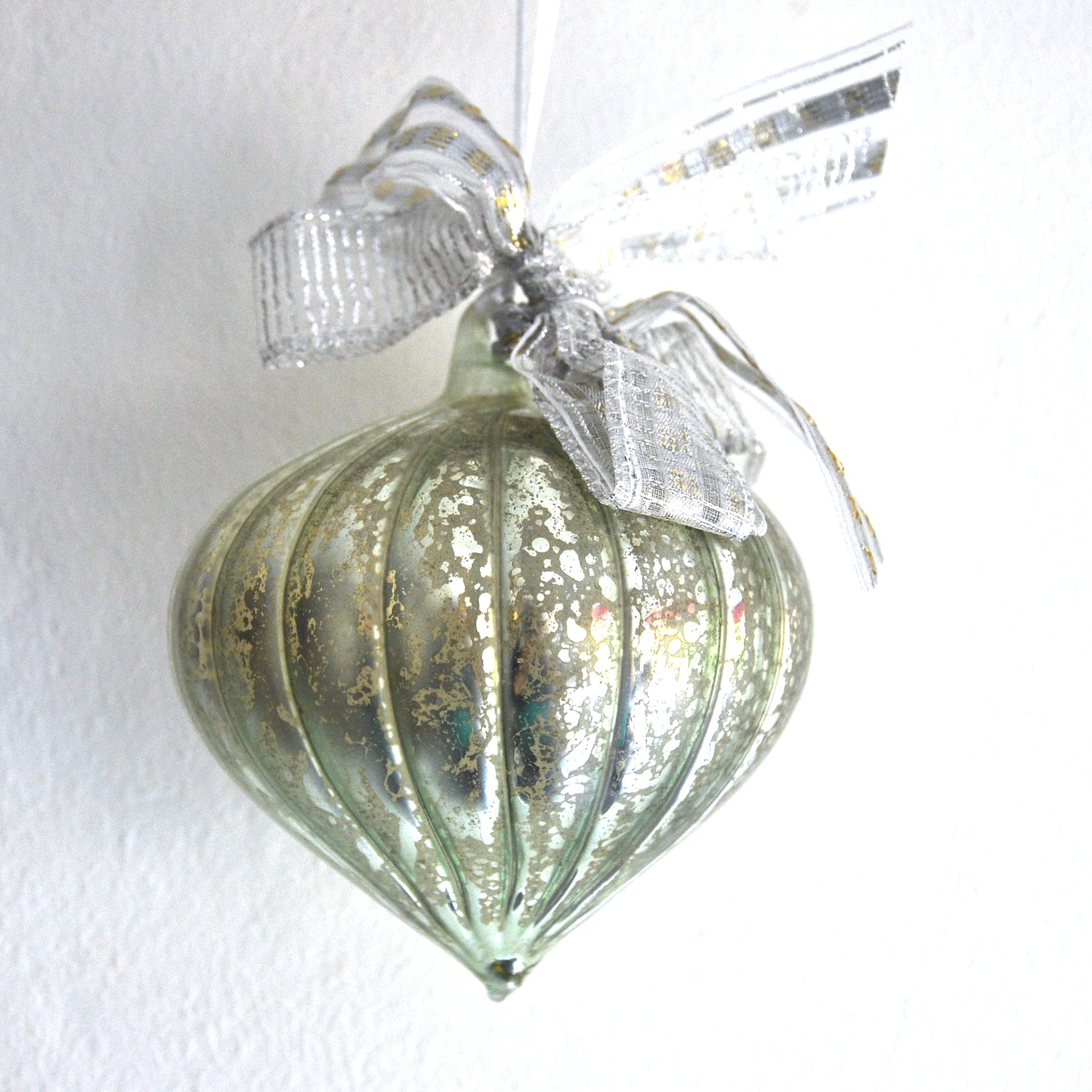 Antique pastel green glass handing Christmas tree decoration. This sultan drop shaped decoration comes with a double silver bow and thread loop for hanging on the tree or around the home.