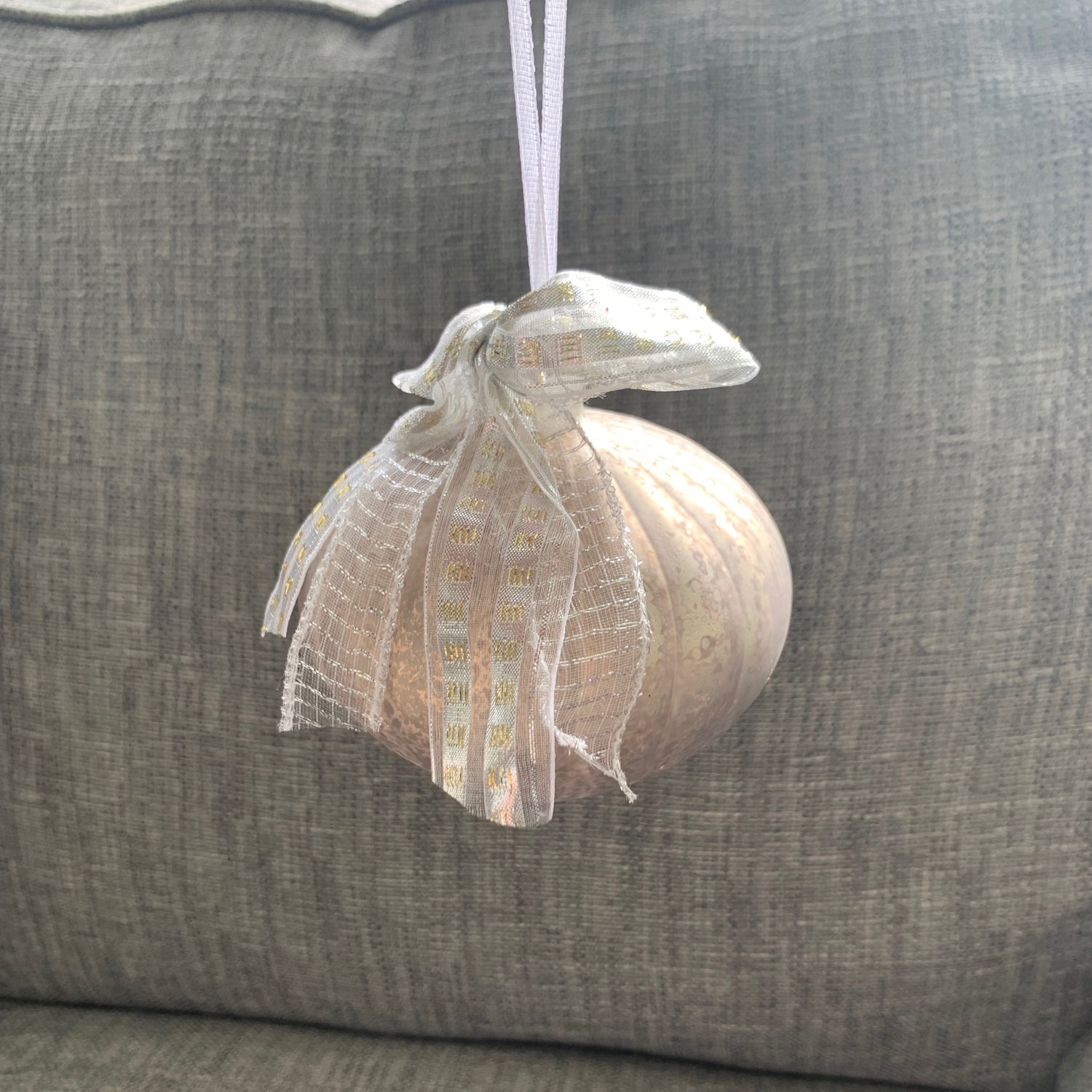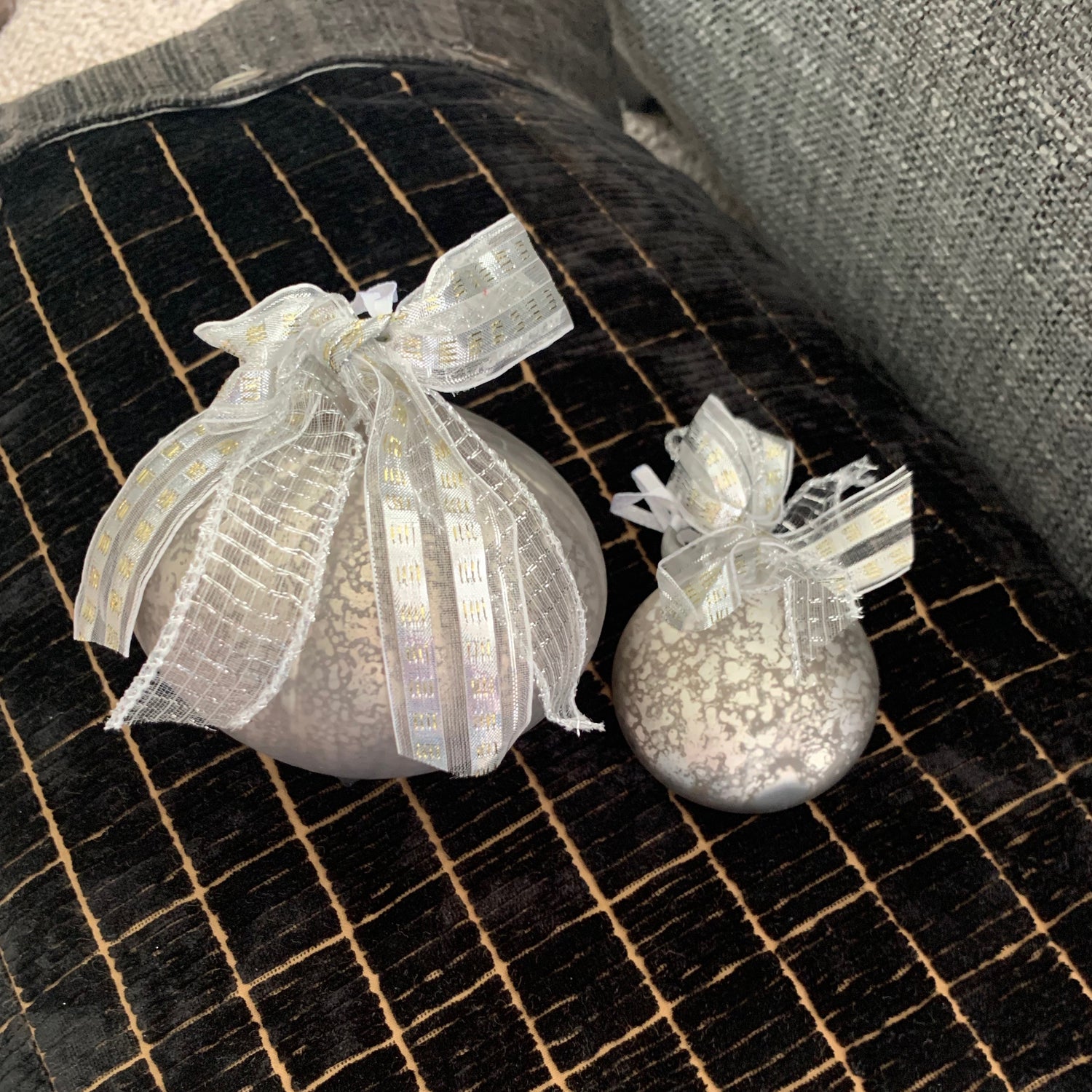 Antique style sultan shaped matt grey glass hanging Christmas tree decorations to bring a touch of class to your festivities! These hand blown glass decorations are accessorised with a double silver bow and ribbon loop for hanging on the tree or around the home.