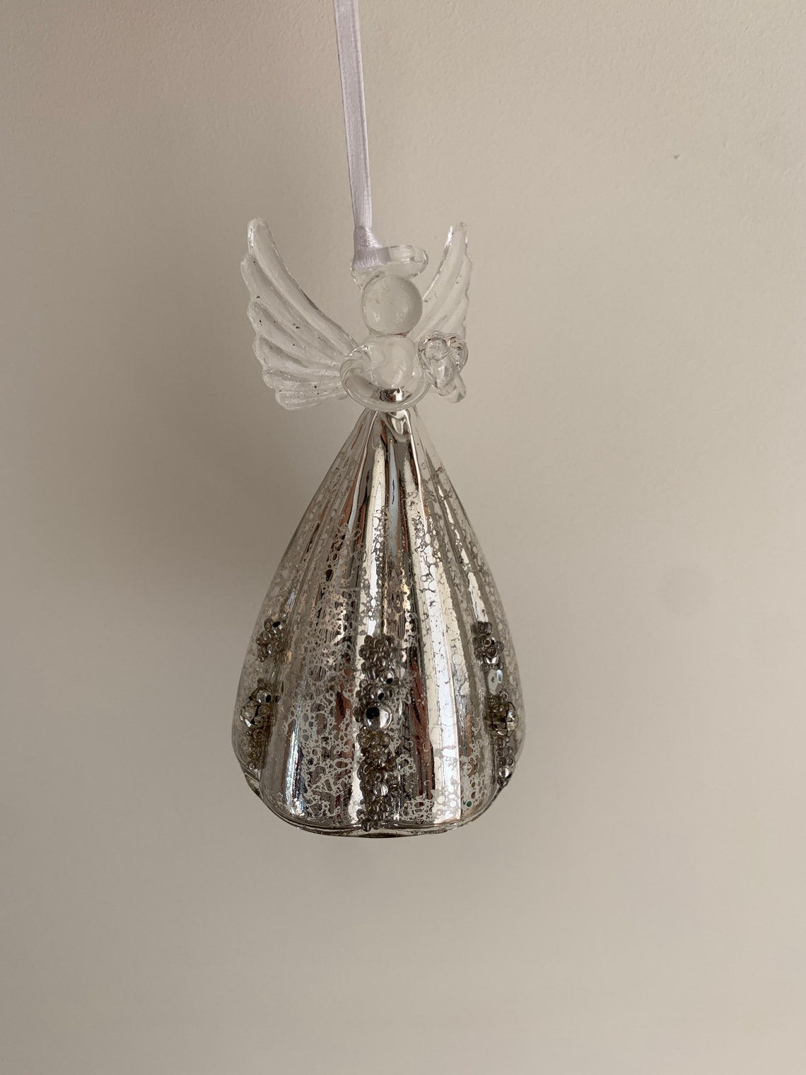 This stunning antique style glass angel holding a heart with silver beading and a fluted skirt will be the perfect finishing touch to your Christmas tree! The angel can sit on top of your Christmas tree as a topper or has a loop for hanging around the house.