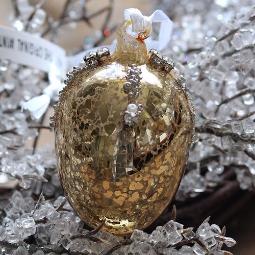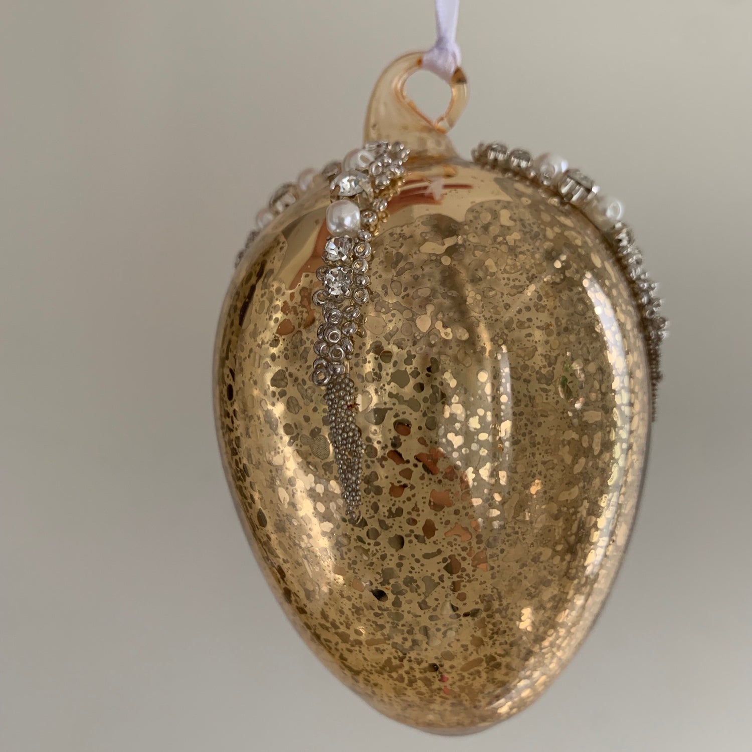 Antique style gold glass hanging Christmas decoration with beads, pearls and diamante detailing to bring a touch of class to your festivities! This egg shaped decoration comes with a white ribbon loop for hanging on the tree or around the home.