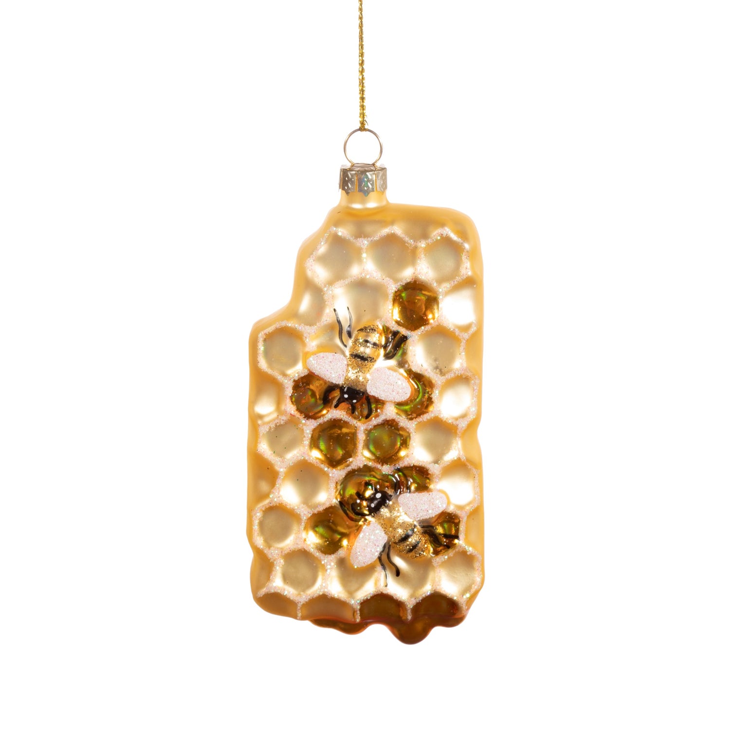Glass hanging Christmas decoration with golden honeycomb covered in worker bees and dripping with honey. Almost looks good enough to eat! The bauble is made from glass and has a golden thread to hang from your tree or around your home.