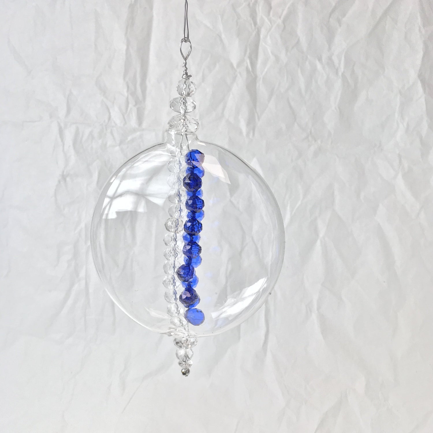 These striking glass decorations have strings of blue and clear glass beads inside them that glint when they catch the light.