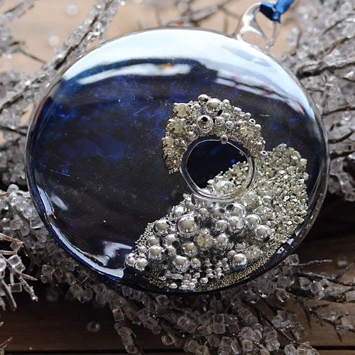This gorgeous blue glass Christmas tree decoration is a flattened sphere shape, and includes some beautiful silver/diamante treasures hidden inside. It really would make a stunning addition to your tree.
