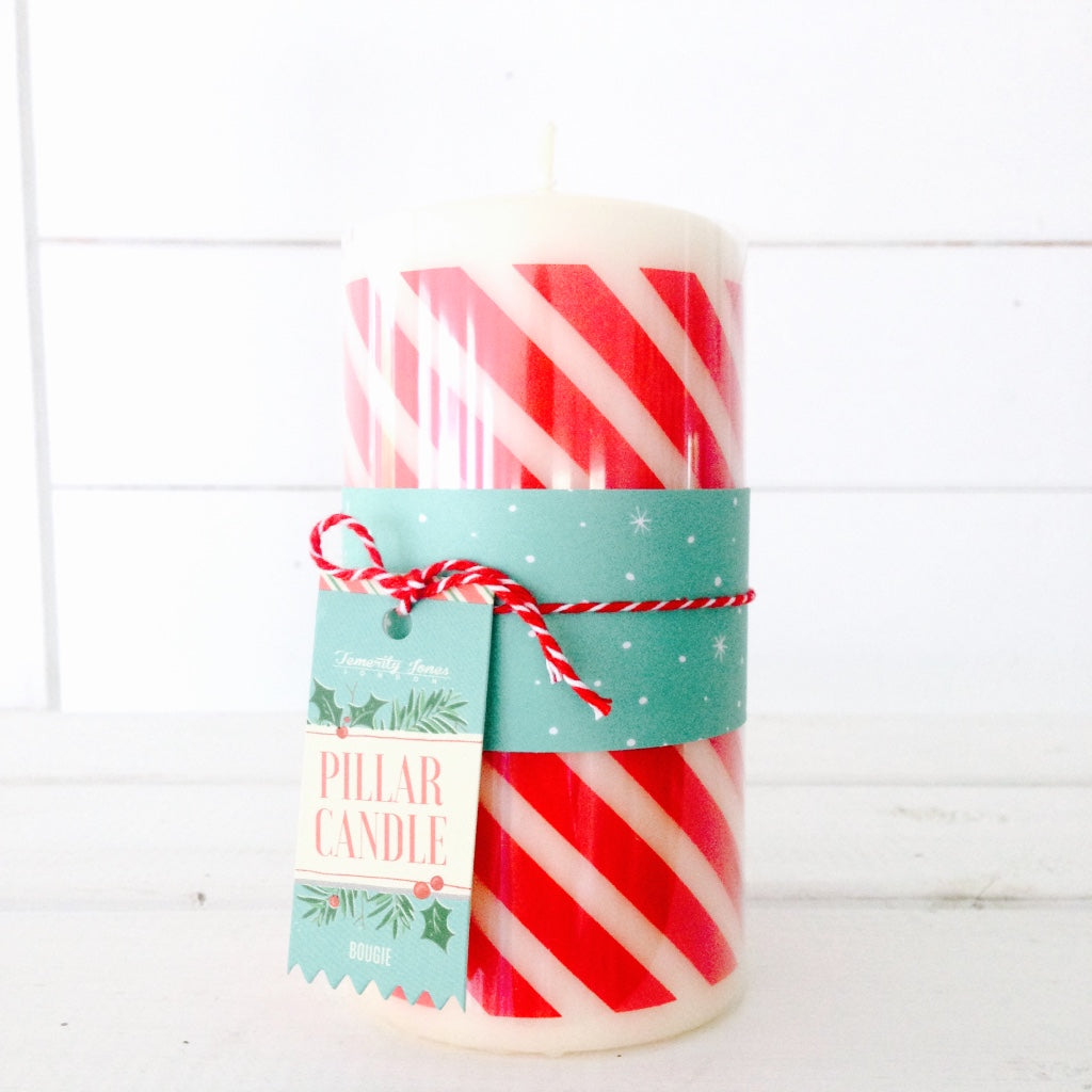 Red and white candy cane stripe pillar candle, to create a festive red and white Christmas theme to your table and home. Position inside a table wreath for a retro advent feel. This candle is not scented, but is part of a collection by Temerity Jones, available in two other sizes.