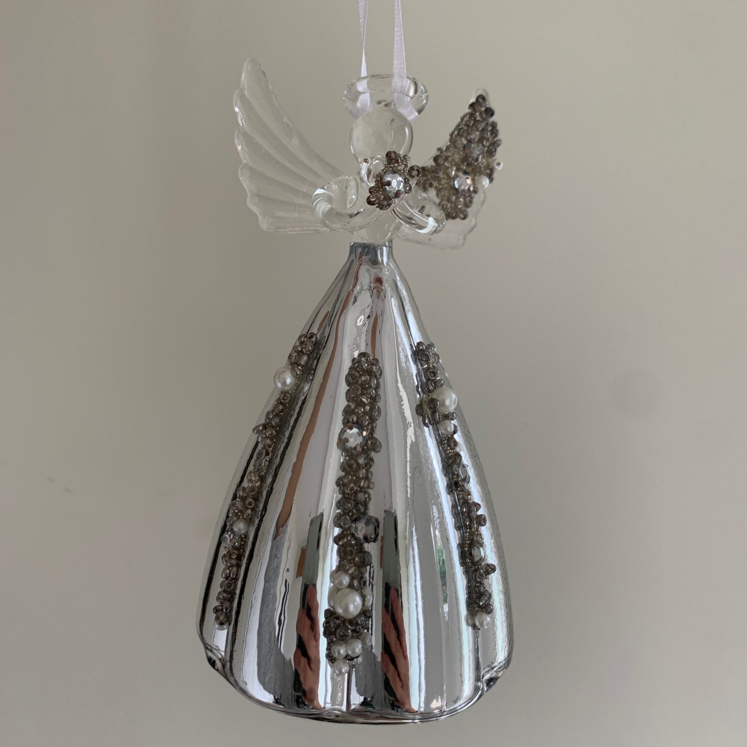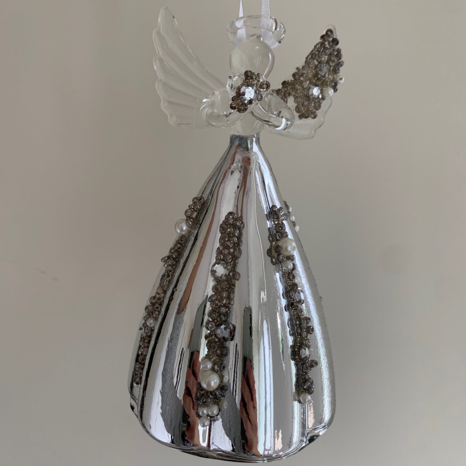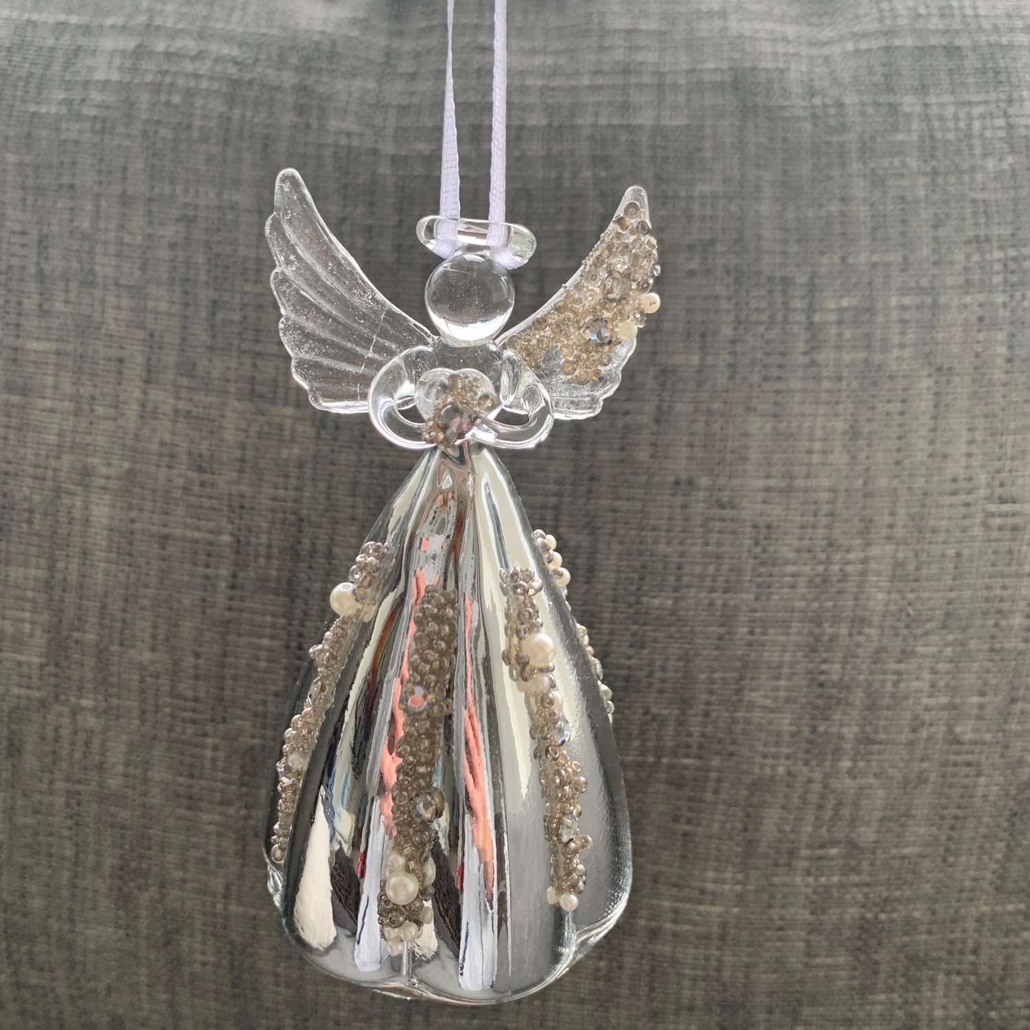 This stunning clear glass angel with silver beading will be the perfect finishing touch to your Christmas tree! The angel can sit on top of your Christmas tree as a topper or has a loop for hanging around the house.