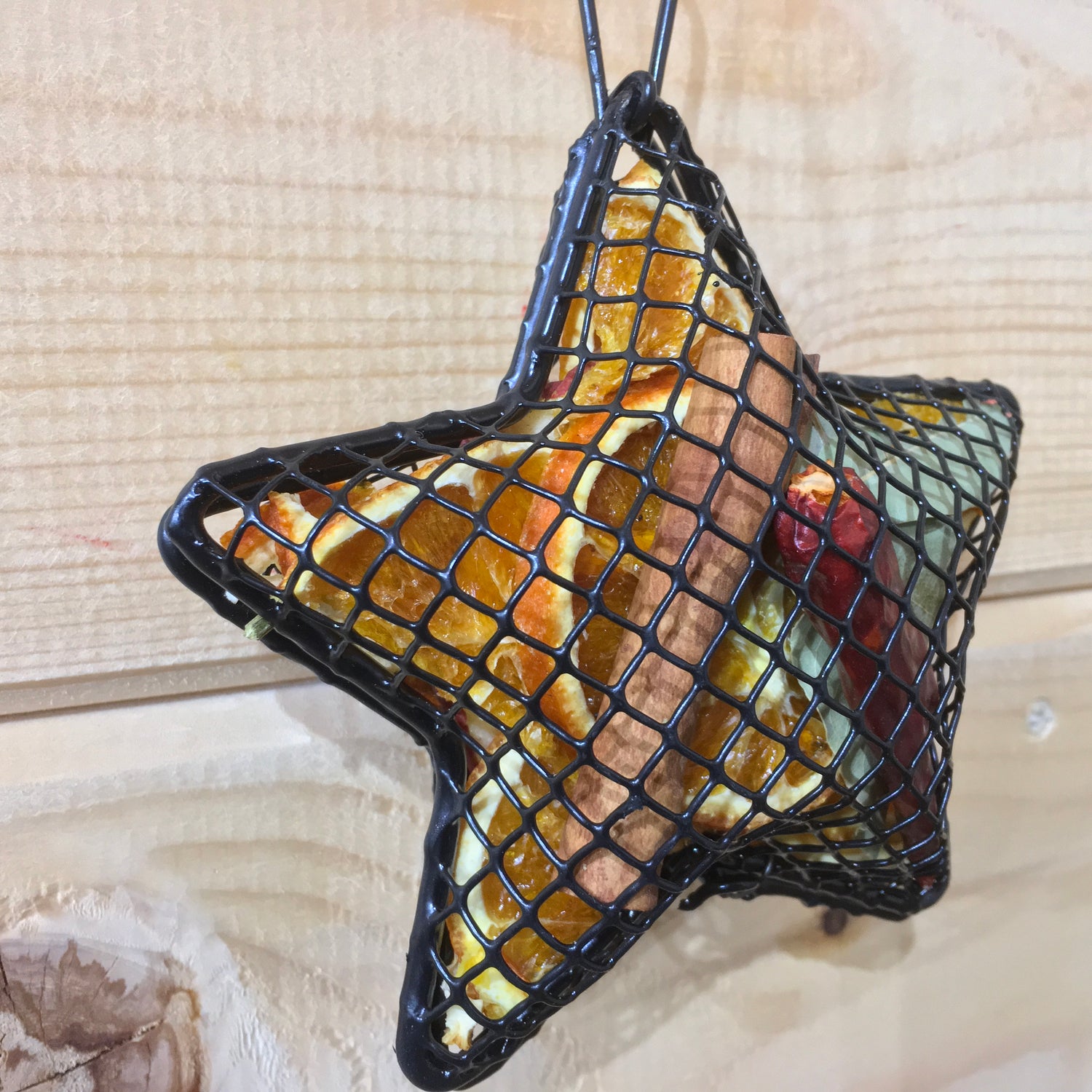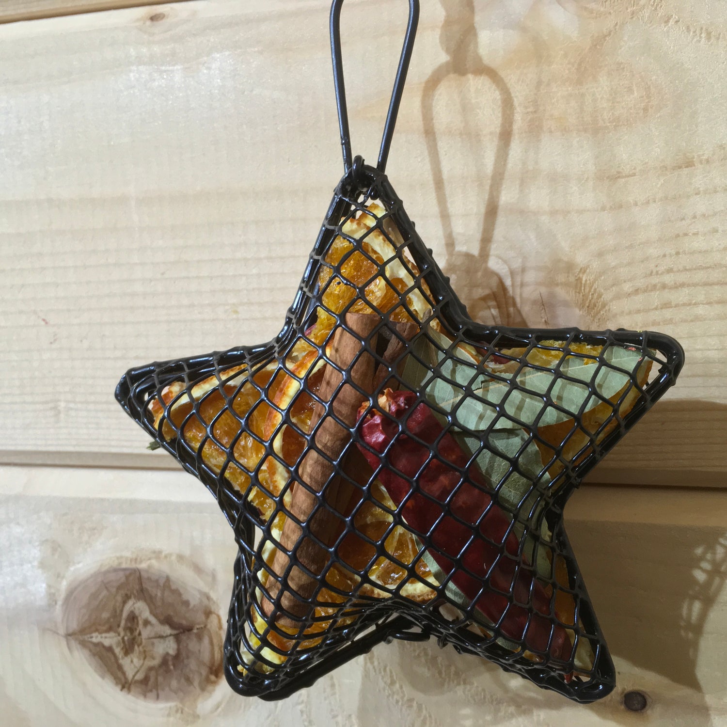 The wire mesh star is filled with orange slices, chili peppers, cinnamon and bay leaves which have a delicious citrus and cinnamon fragrance, that