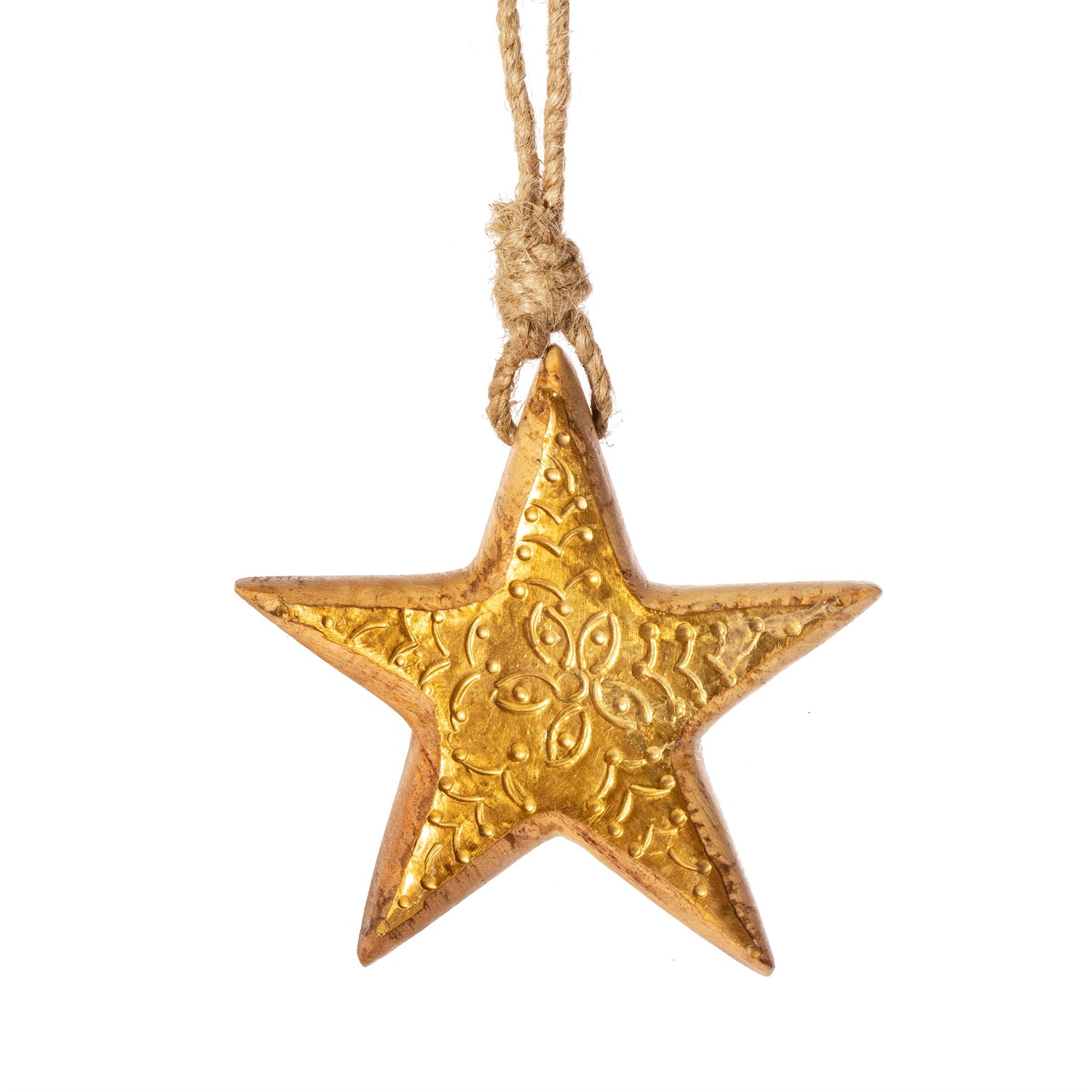 Simply beautiful, engraved wooden star shaped Christmas tree decoration to bring a rustic vibe to your festivities. Made from mango wood, with a yarn hanging loop and featuring a carved texture design in gold.