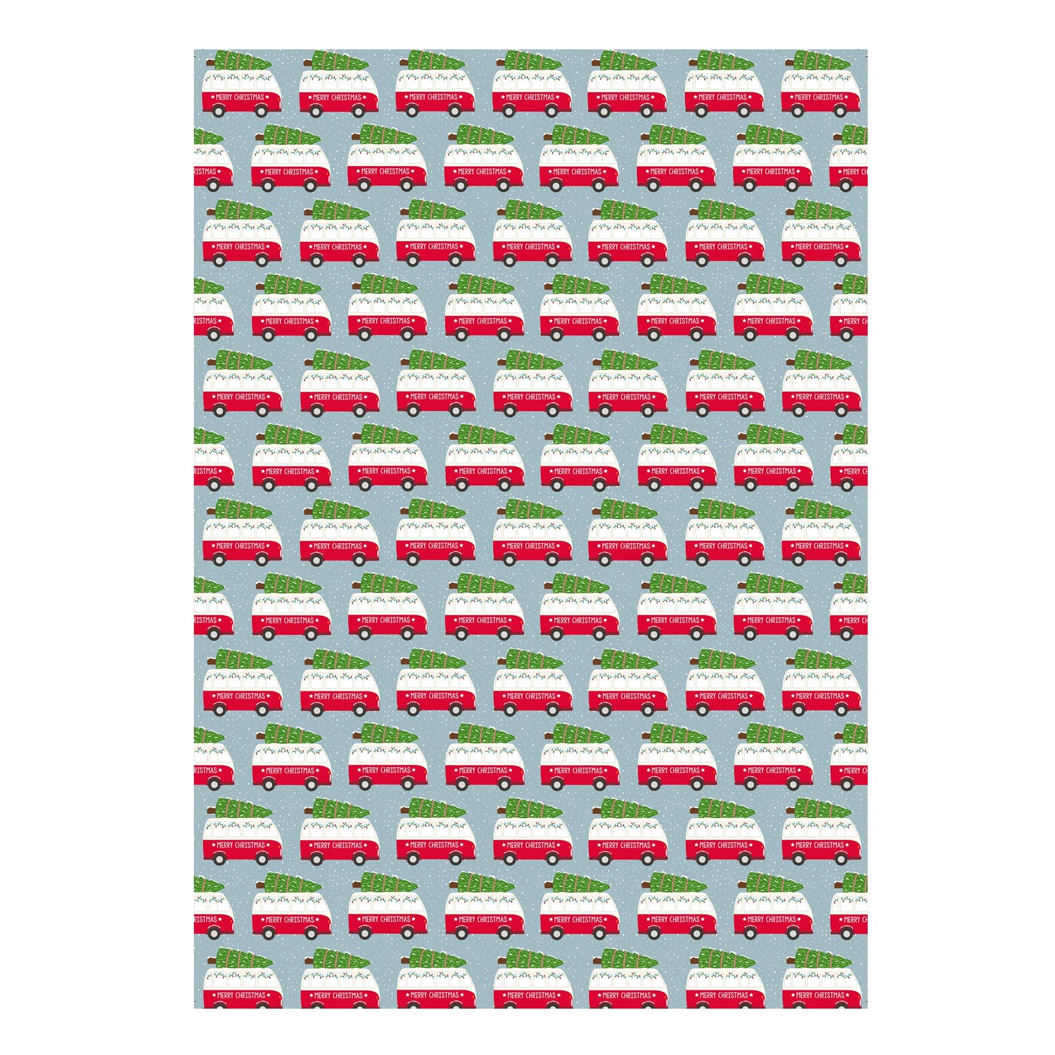 Gorgeous Christmas wrapping paper featuring a festive red and white VW camper van carrying a Christmas tree on the roof and 'Merry Christmas' on the side, in a repeating pattern!