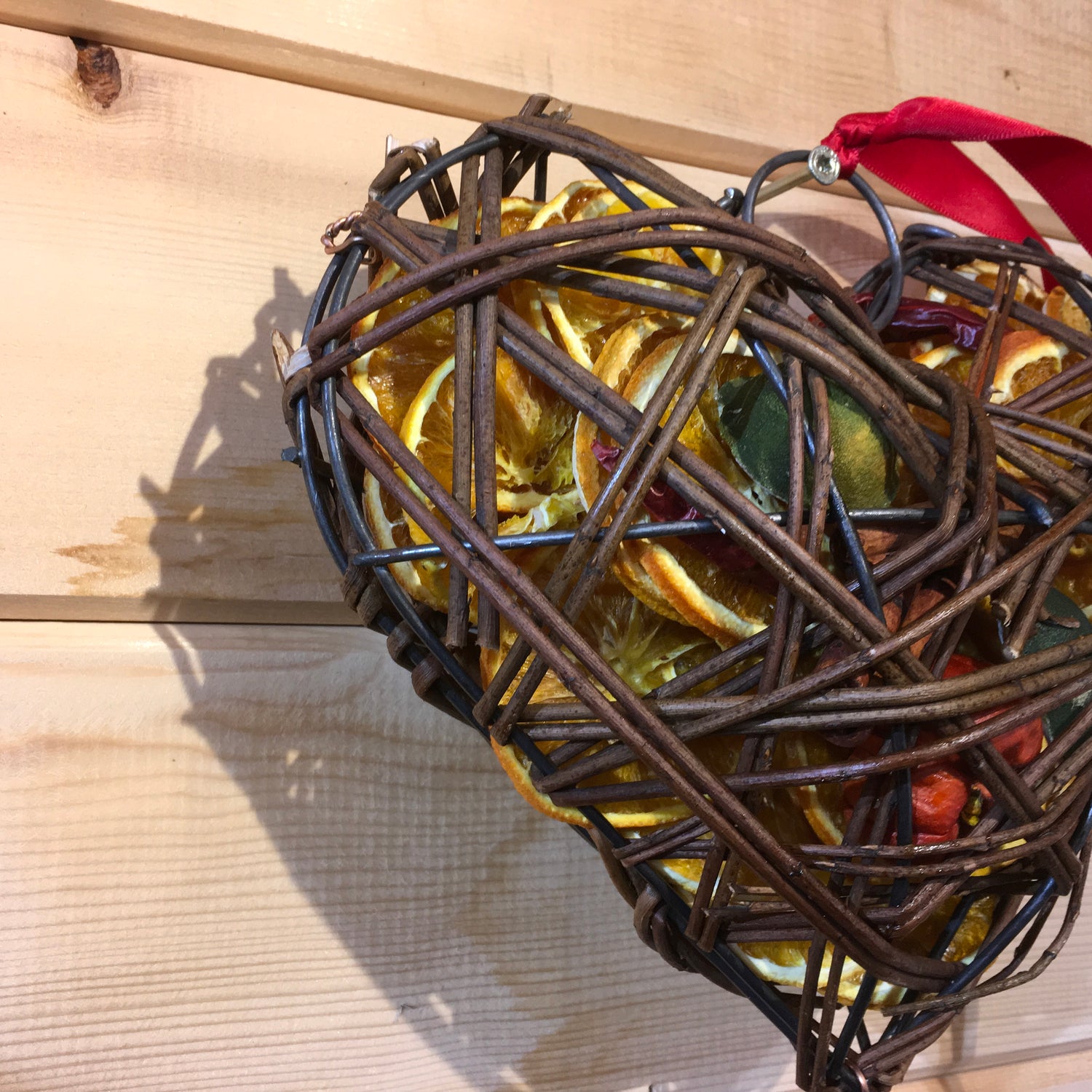 Beautiful heart shaped wicker case filled with dried fruits and scented with a wonderful Christmas fragrance, these are perfect for your mantelpiece or
