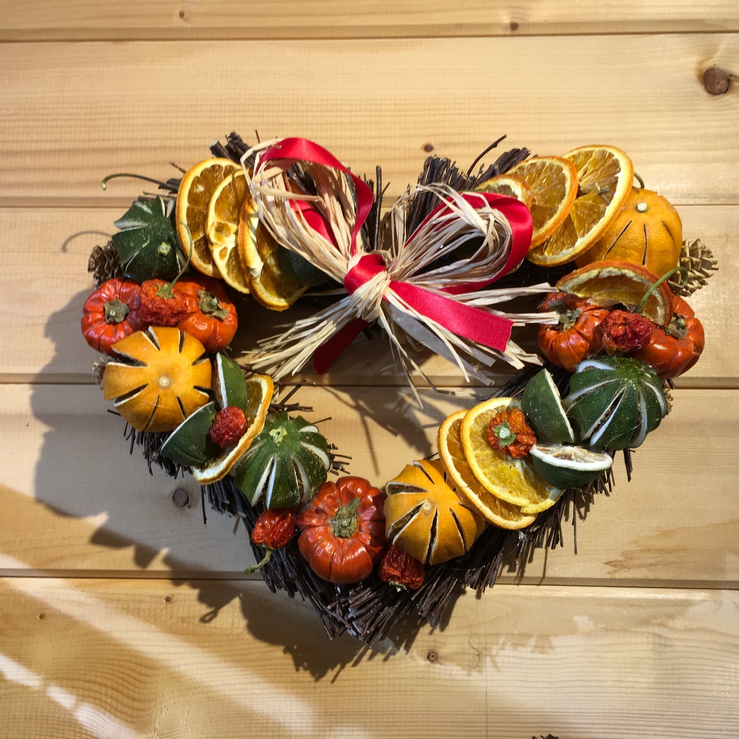 Stunning heart shaped twig wreath that has been beautifully decorated with an assortment of dried fruits, cinnamon sticks and pine cones, and scented with