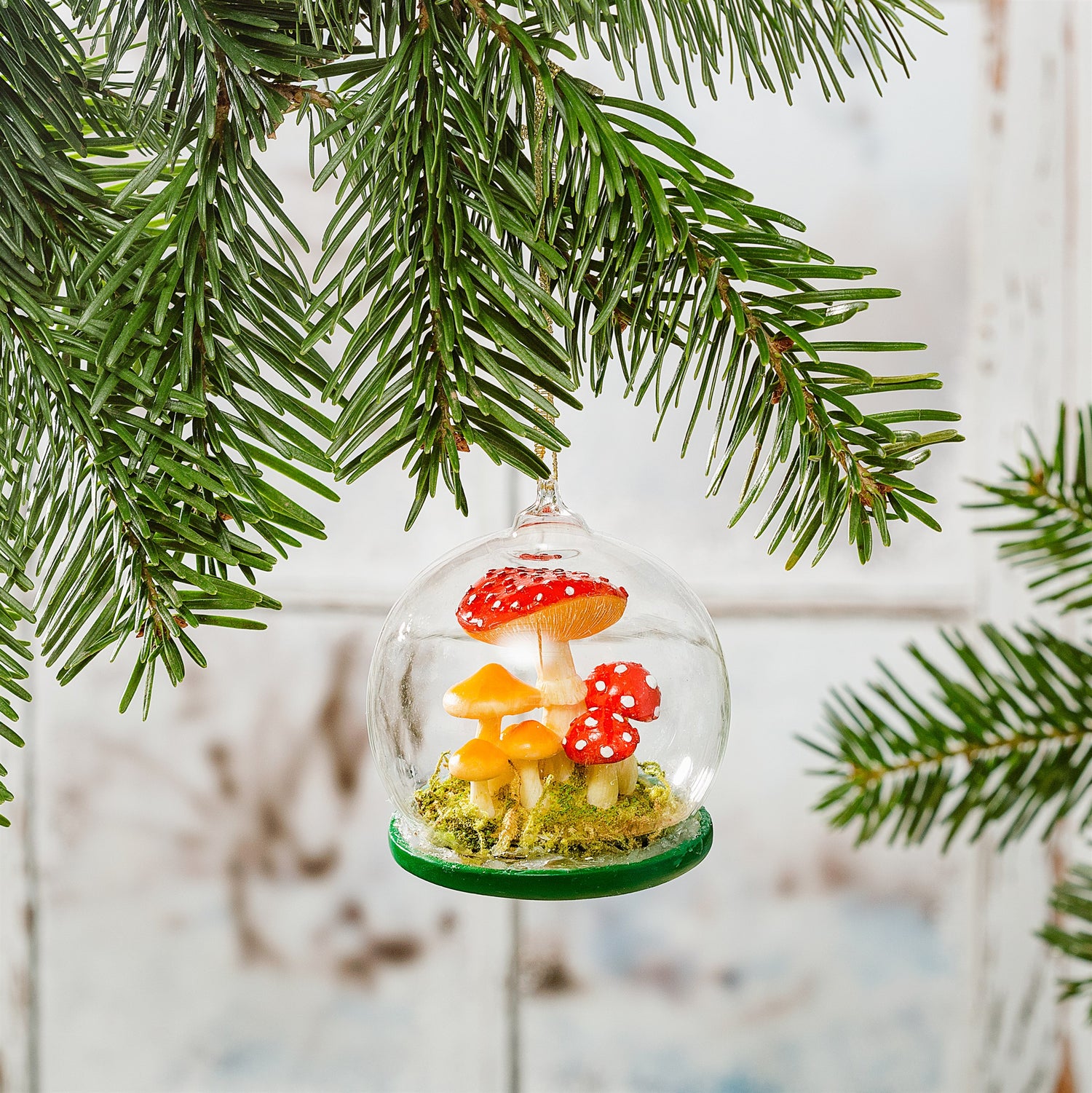 A lovely woodland scene, with mushrooms and toadstools - encapsulated in a glass dome, with a ribbon to hang from your Christmas tree. This would make a wonderful gift for a gardener or someone who loves the outdoors!