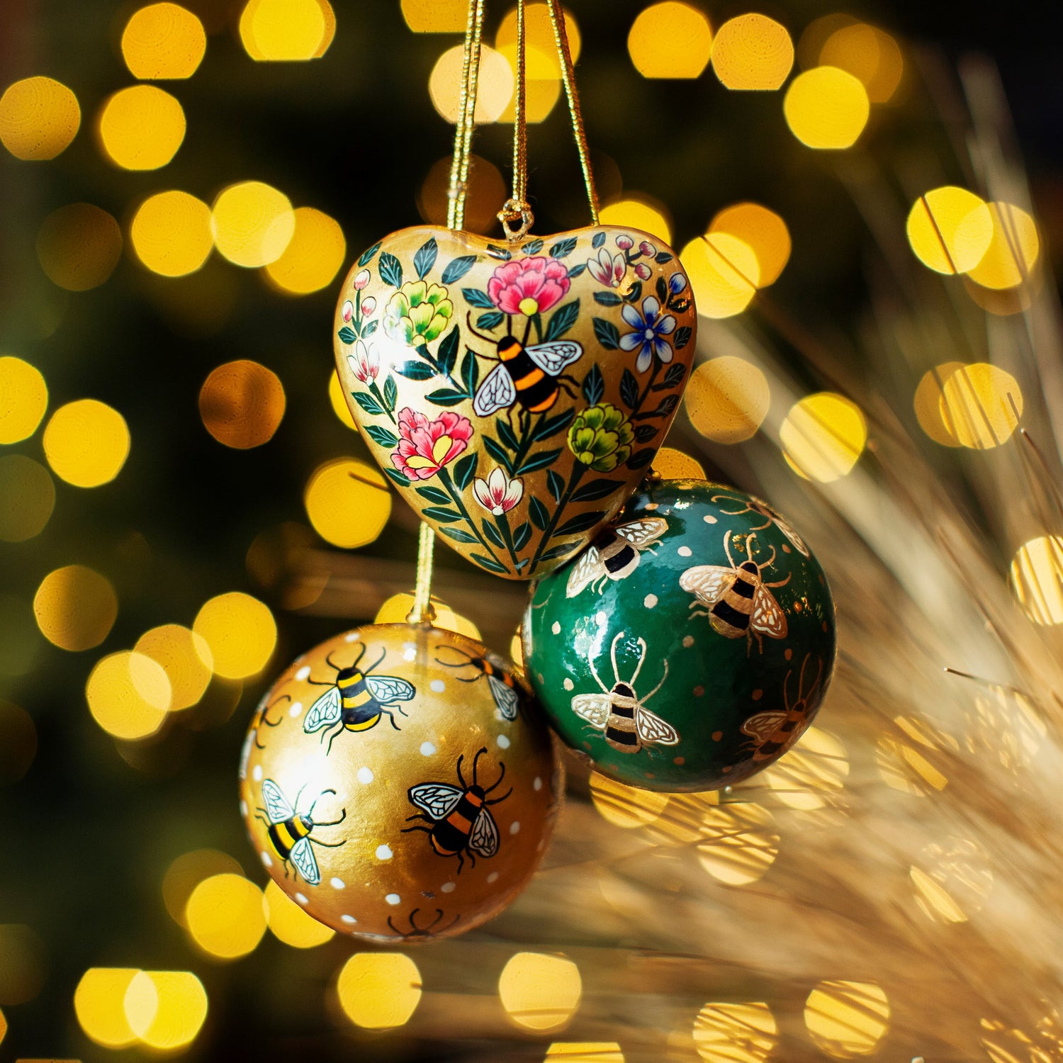This glitzy green and gold papier-mâché Christmas bauble featuring a cute bee design and gold thread, will add a glamorous, and shimmering touch to your tree. Perfect for a bee lover or gardener!