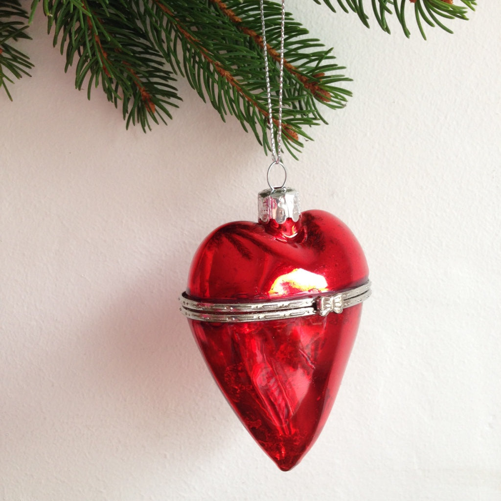 Hanging heart shaped glass ornament for Christmas Tree decoration available in gold silver and red. Opens up to hide a small gift inside, and secures with bow shaped clasp.