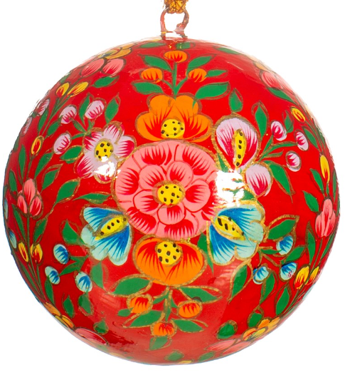 Absolutely stunning floral baubles inspired by Kashmiri embroidery patterns from India. These beautiful hanging Christmas decorations, made from papier-mâché, will add a colourful touch to your tree.