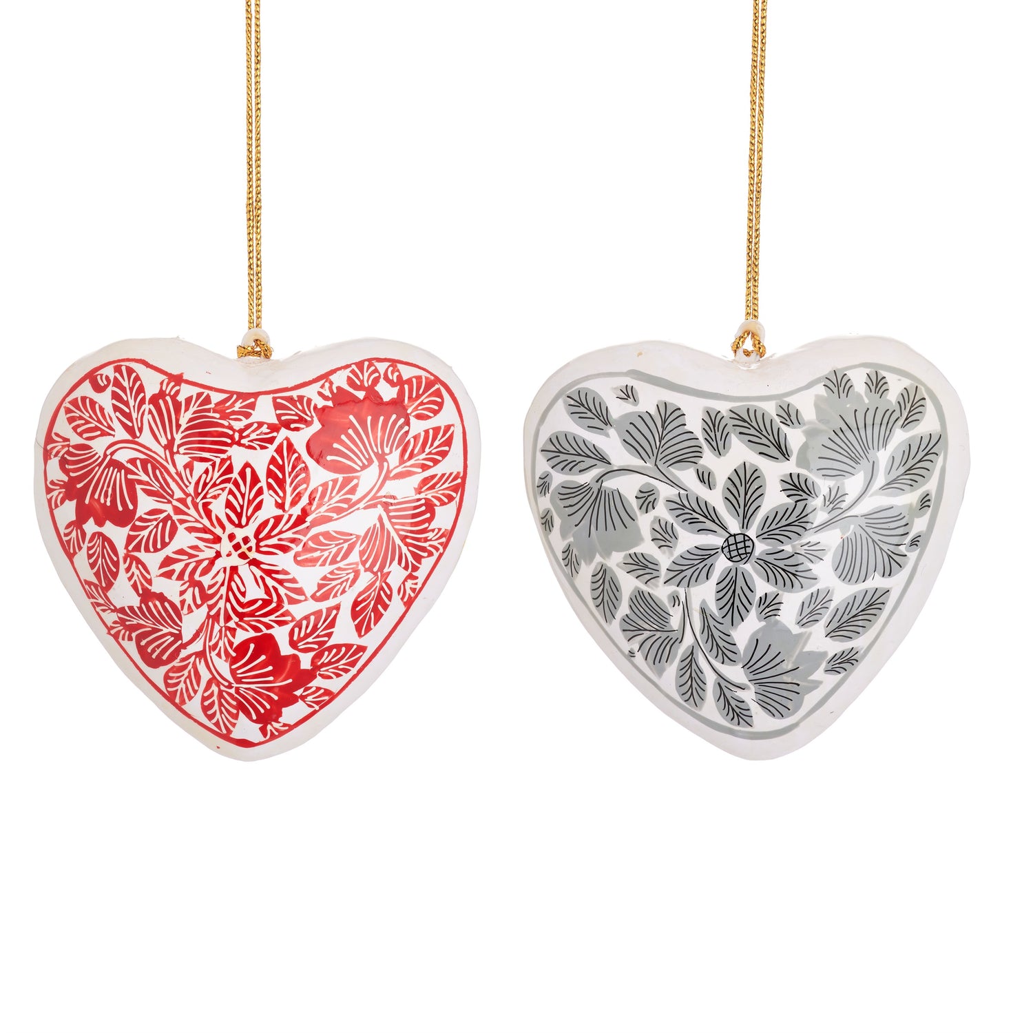 Lovely papier-mâché baubles with an illustrated leaf pattern inspired by Kashmiri embroidery patterns from India. The baubles are heart shaped and come with a gold thread, ready to hang on your Christmas tree or around your home.