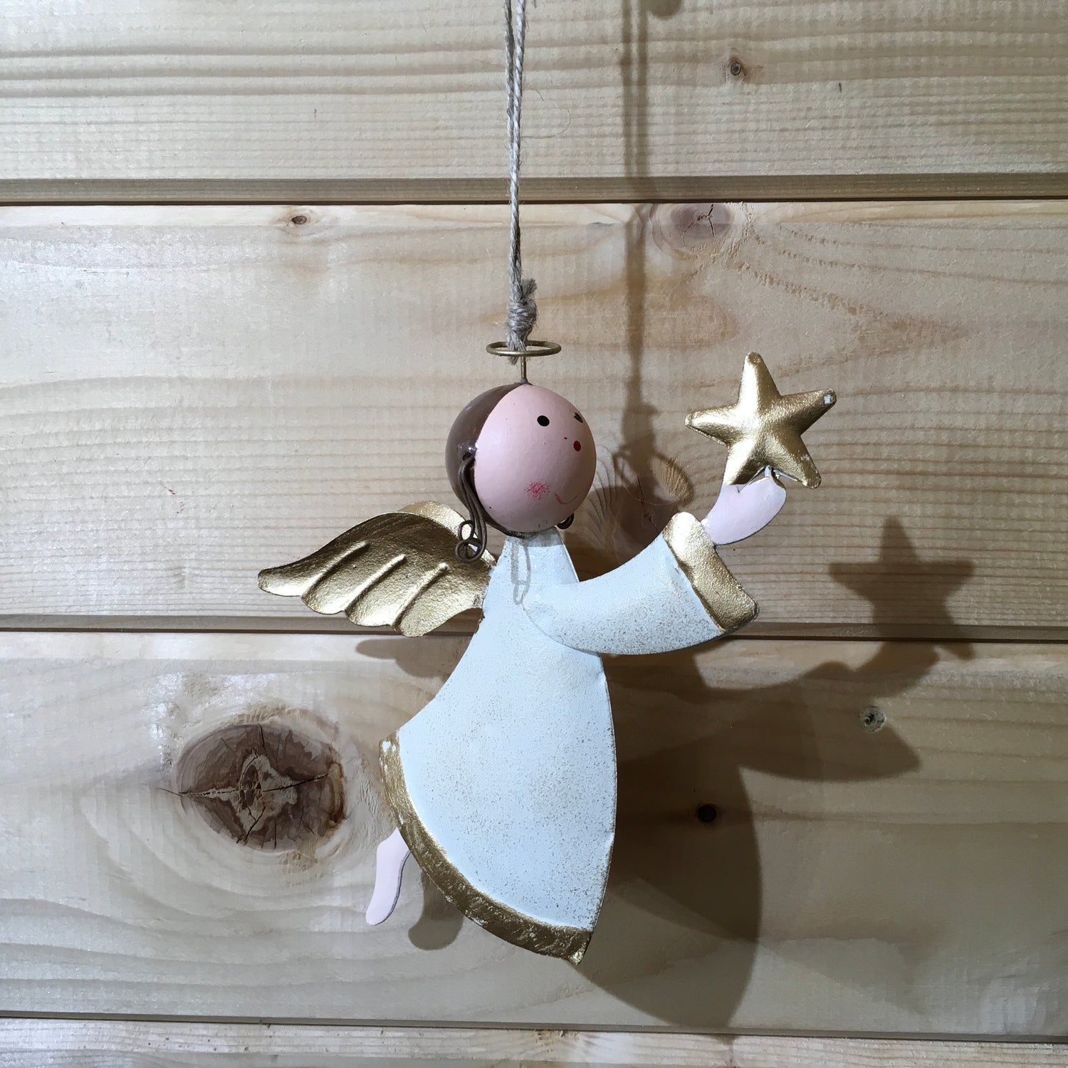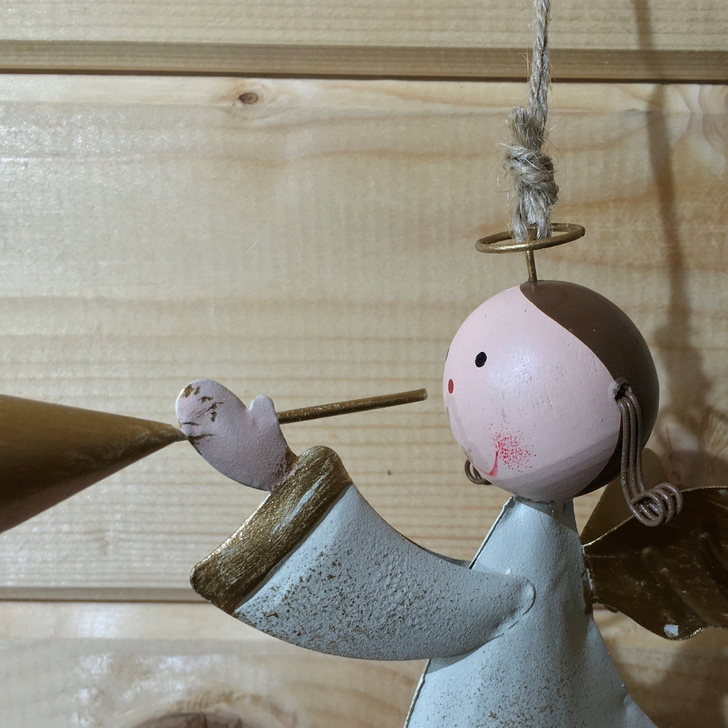 Angels can hang on the tree as well as sit on the top! This large metal angel decoration is blowing a trumpet, heralding the birth of Jesus no doubt!