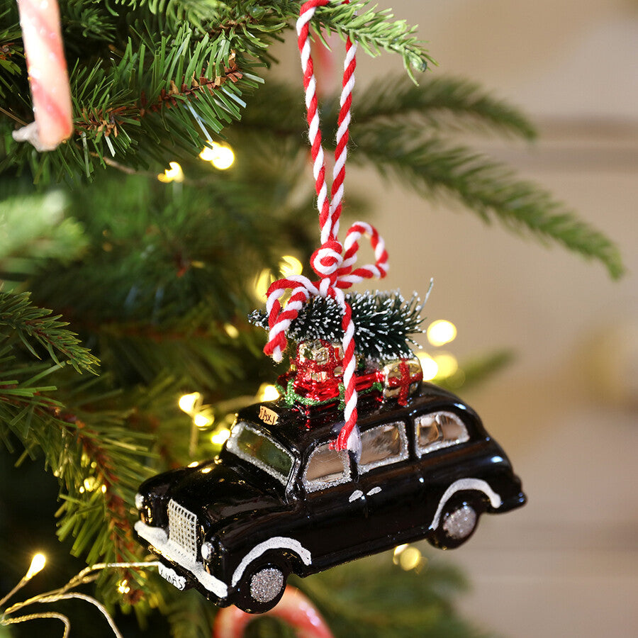 Bring a touch of the big city to the tree with this very cool London black cab carrying a Christmas tree. Made from glass and following a classic Christmas colour scheme of black, gold, red and green.