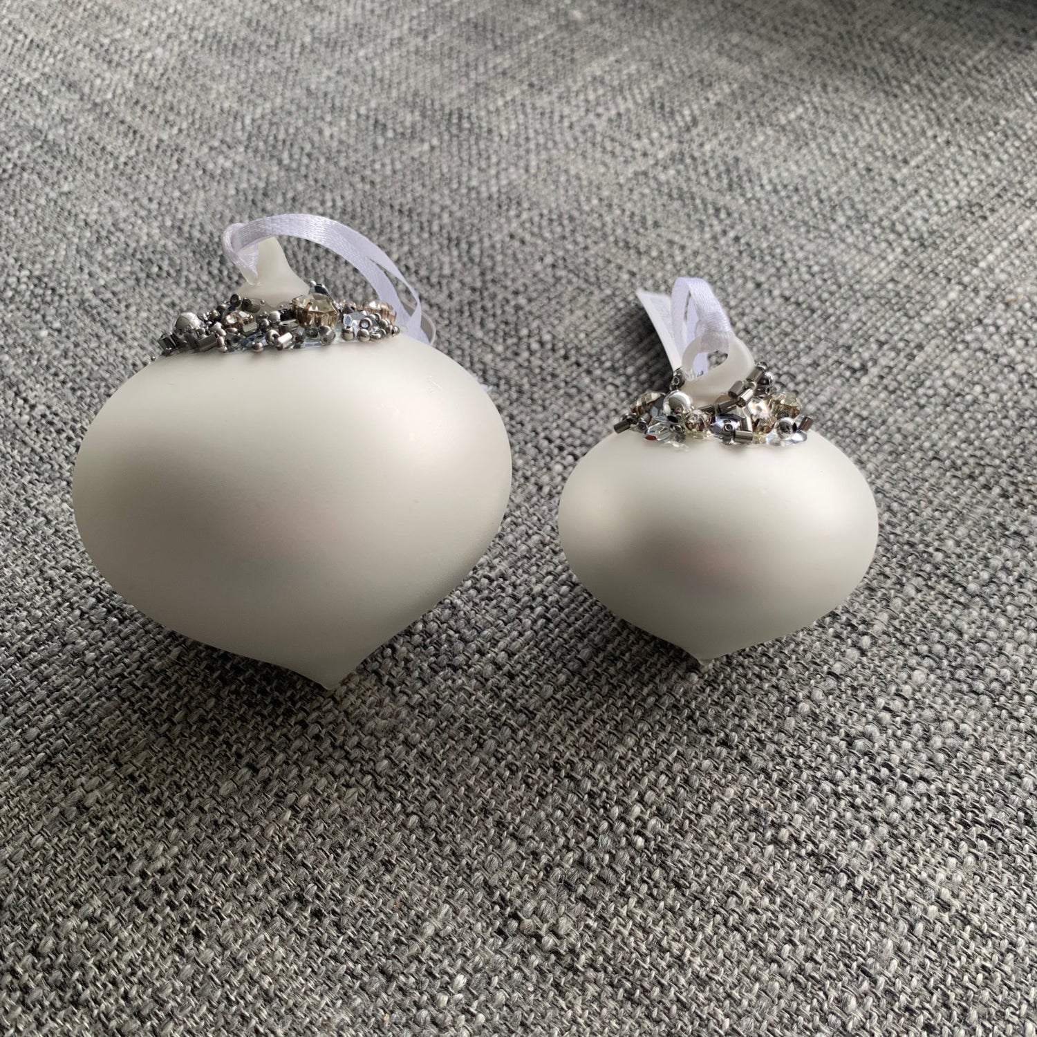 Matt silver sultan shaped glass hanging Christmas tree decoration with stunning beading decoration at the top. This decoration has a ribbon loop for hanging on the tree or around the home.