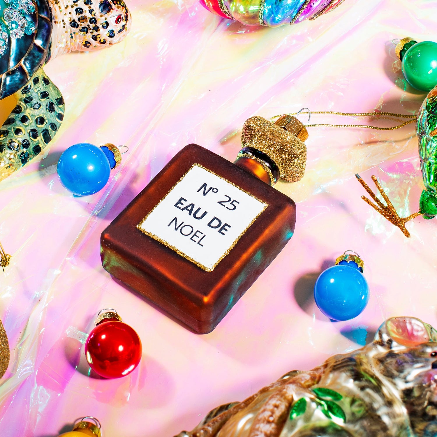 Make sure you're smelling great this Christmas with this classic perfume bottle with the quote 'No 25 EAU DE NOEL'. This glass Christmas decoration has a gold thread loop to hang from the tree or around your home.