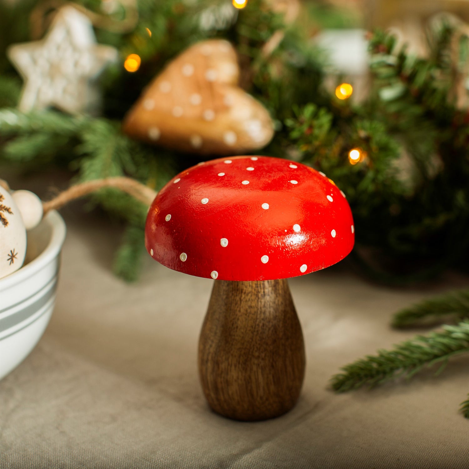 Lovely natural wooden mushroom shaped Christmas ornament with red and white polka dotted top, to bring a rustic vibe to your festivities. Made from mango wood, this decoration is free standing and would look great on a mantlepiece or table.