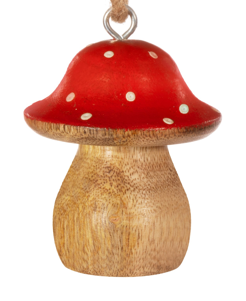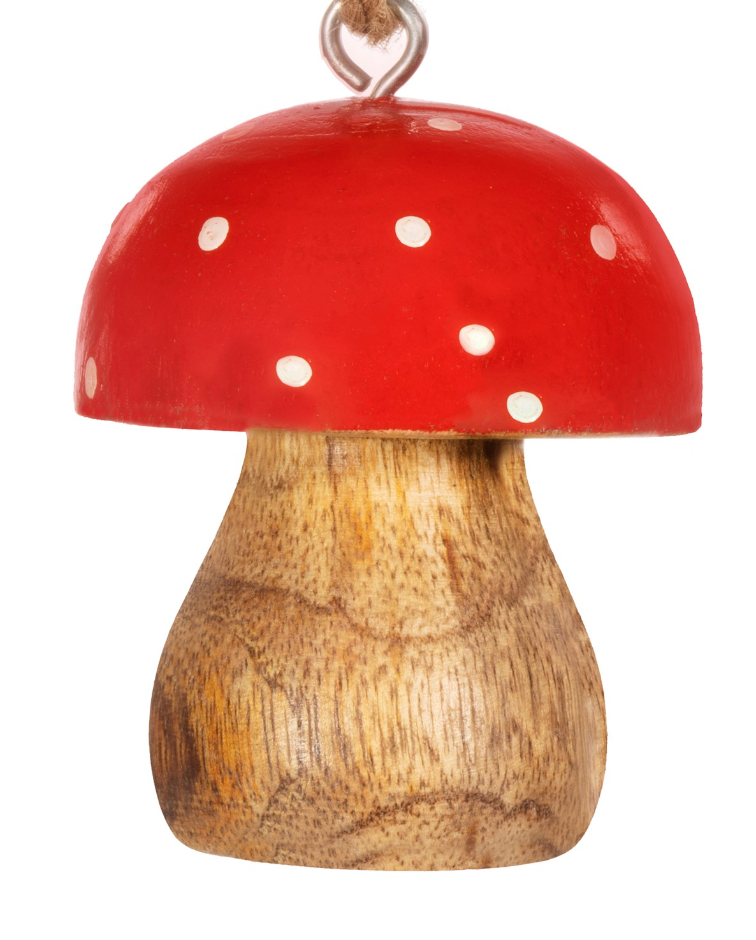 Lovely natural wooden mushroom shaped Christmas tree decorations with red and white polka dotted tops, to bring a rustic vibe to your festivities. Made from mango wood, with a yarn hanging loop these come in two variations.