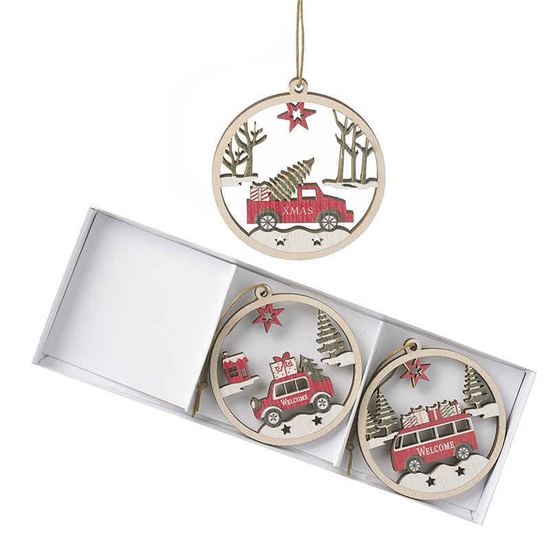 Set of 3 hanging circular shaped Christmas tree decorations in a red and green colour-way, featuring a range of festive vehicles. These decorations are made from wood, and come with a twine loop for hanging on the tree or around the home.