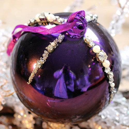 Gorgeous dark shiny purple/aubergine glass bauble Christmas tree decoration. The top of the glass ornament is hand-decorated with diamante jewels, with pearl and silver beading. They come with a purple ribbon loop for hanging.