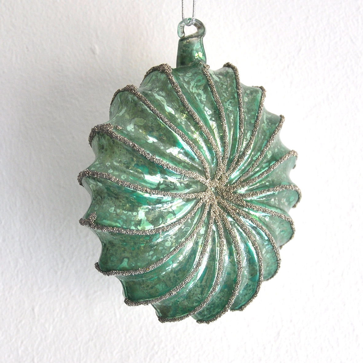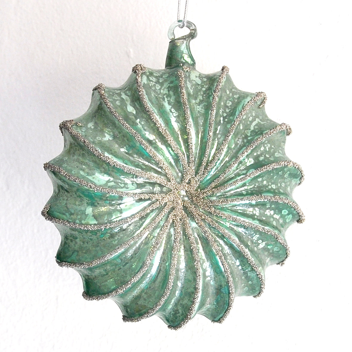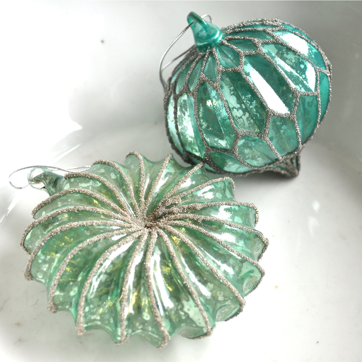 This Flattened- ball shaped turquoise Christmas tree decoration is made from blown glass with silver glitter on the ridges.