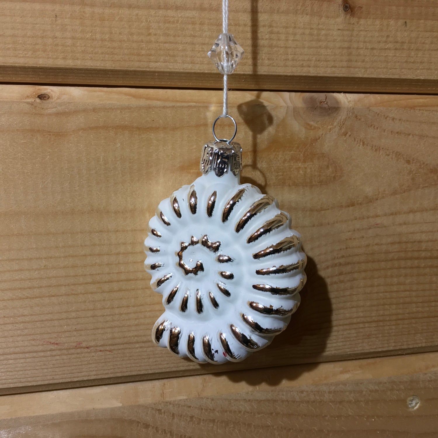 A white seashell hanging decoration to hang on your Christmas Tree or around the home for a winter wonderland feel.